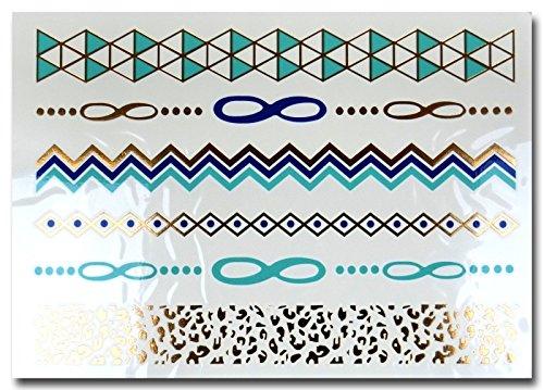 LATEST DESIGN METALLIC temporary TATTOOS!! You do not need to buy design you do not like. You can select the tattoo design whatever you like! How to apply on your skin. Clean and dry your skin where you want to apply the temporary tattoo design. Cut out the tattoo design from the sheet and remove the plastic cover. Place the tattoo design onto your skin. (paper side up) Thoroughly have the tattoo over the paper wet with a water absorbed sponge or cloth / towel. After 20 - 30 seconds, remove the paper and let it dry. How to remove Apply baby oil or rubbing alcohol, rub the tattoo design gently until fully removed.