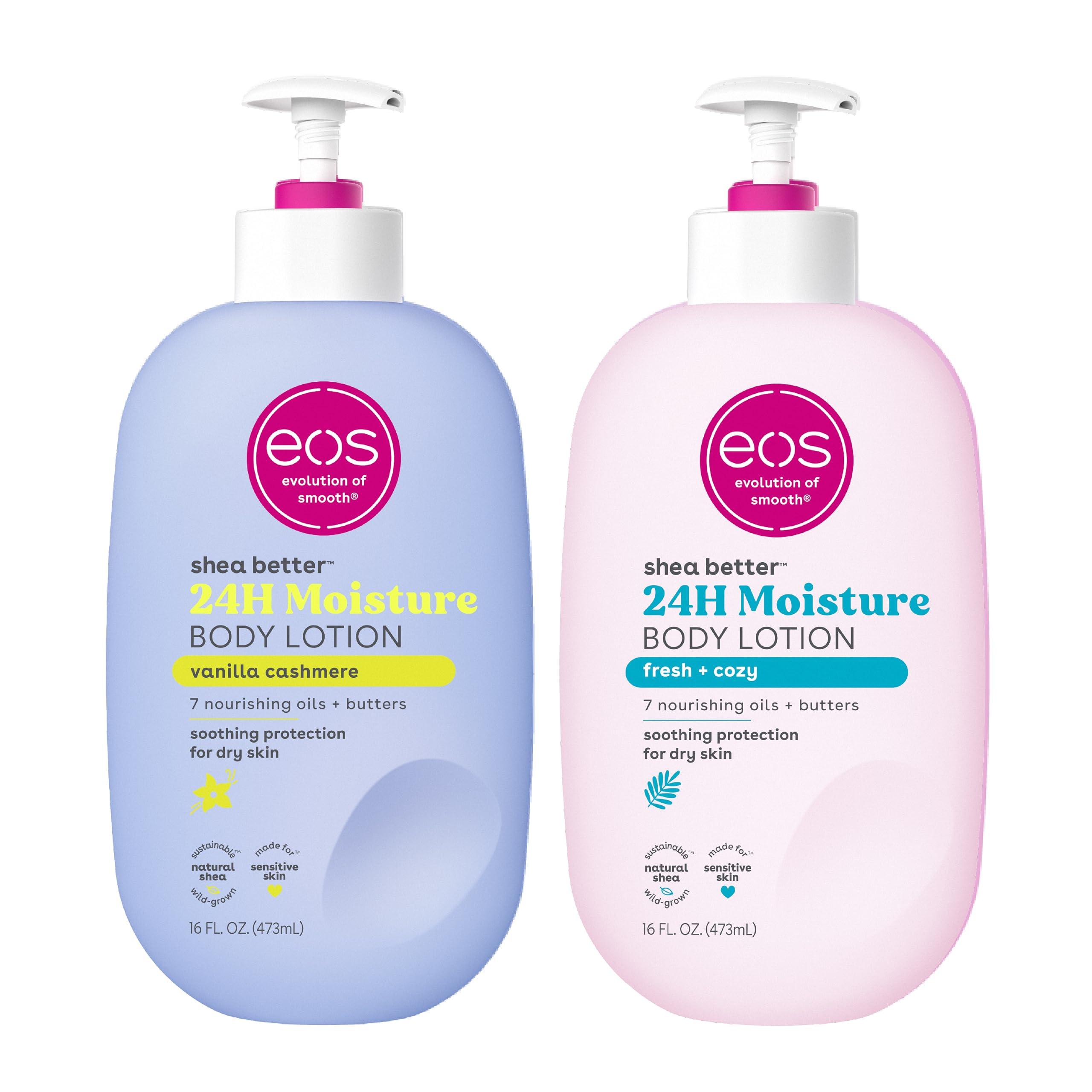 - SHEA BETTER BODY LOTION: Our sweet and nuzzly Vanilla Cashmere scent contains fragrance notes of whipped vanilla, soft musk and cozy caramel. eos 24-hour hydration body lotion is made with natural ingredients to leave your skin smooth from head-to-toe.