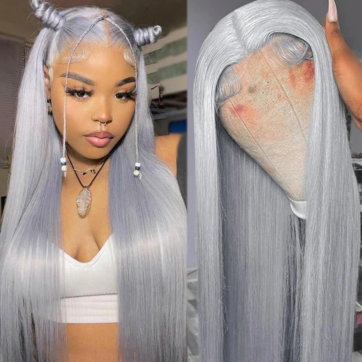 - Grey 13x4 HD Lace Front Wigs Human Hair MaterialNo synthetic blends! 100% unprocessed 10A Brazilian virgin human hair lace front wigs, cut from healthy young female head directly, clean, soft and bouncy, no chemical process. Natural shiny human hair wig can be dyed, straightened, curled, and restyled, no smell.