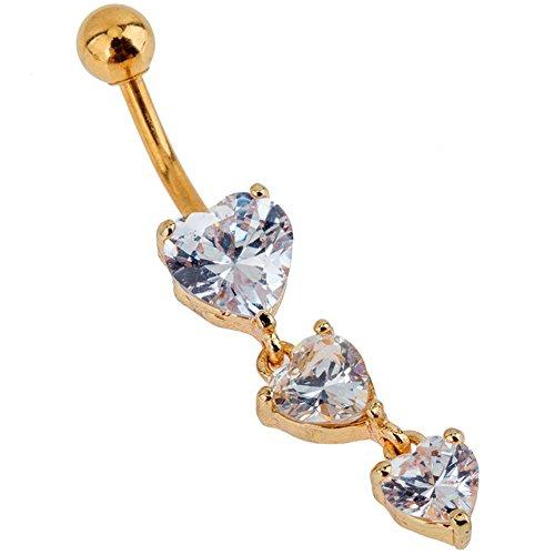 Romantic Golden Colored Belly Ring With Hearts Shaped Pendant and Clear Crystal. The length of the bar is 0.4" and the diameter of the ball is 0.2". Please note that the color might slightly vary from the image.
