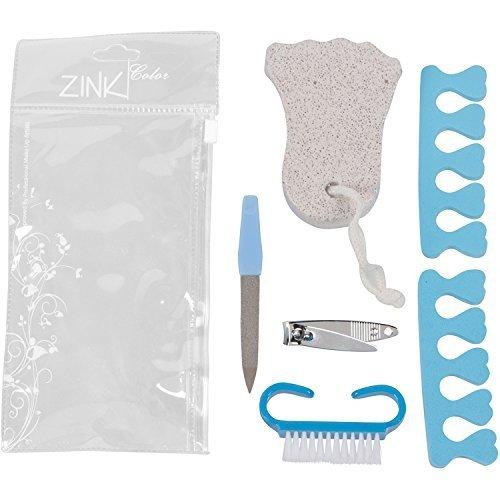 A travel size clear pouch contain everything you needed to care for your feet. This 7 pieces pedicure spa set contains: 1 PVC pouch , 1 nail clipper , 1 cuticle brush , 1 foot shape callus file , 1 nail file and 2 toe separator. ALL seven items can be tuck in the travel size bag which measure about 7ins x 4ins big. It is a great item to have in your bathroom or on the go.