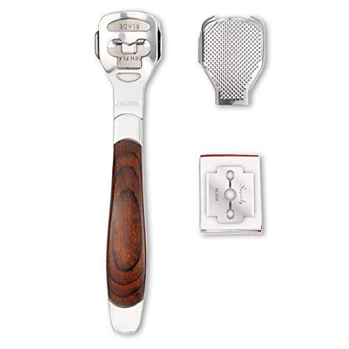 - Premium QualityCrafted from high-quality polished stainless steel and solid wood, this callus shaver is designed for durability and long-lasting use. The handle is smoothly polished for a comfortable grip and is built to withstand daily use without deformation. Includes 10 replacement blades and 1 file head.